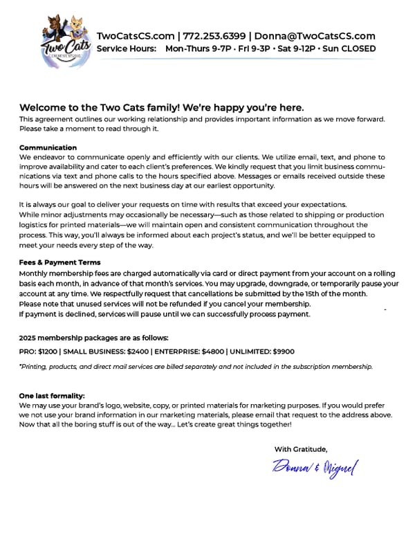 When we receive your membership application and first month's payment, you will receive an email confirming your purchase as well as a receipt for your payment. We will also reach out to you personally to discuss your goals and project needs. Our Client Service Agreement is posted below. Please read through it and only proceed if you understand and agree with the terms outlined.
